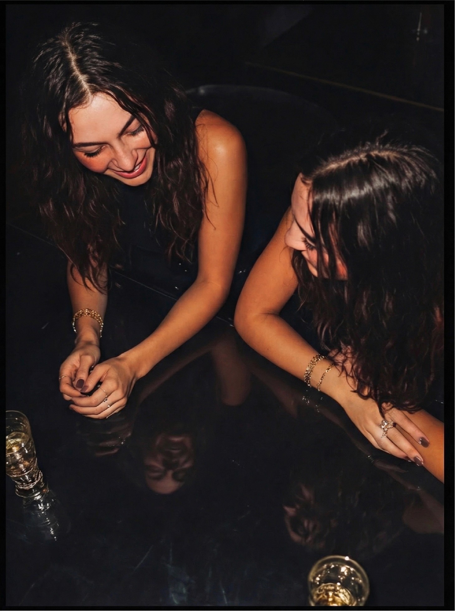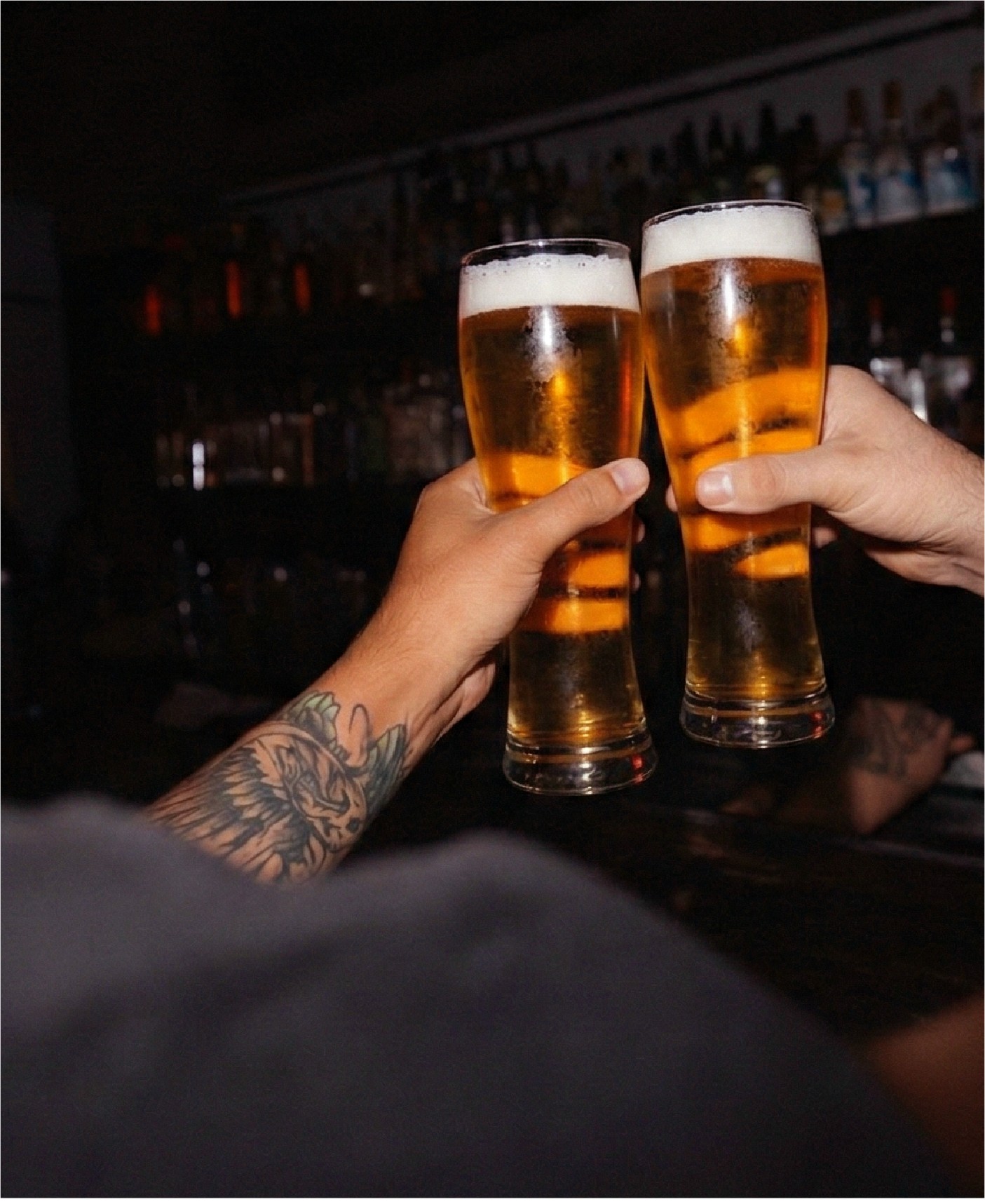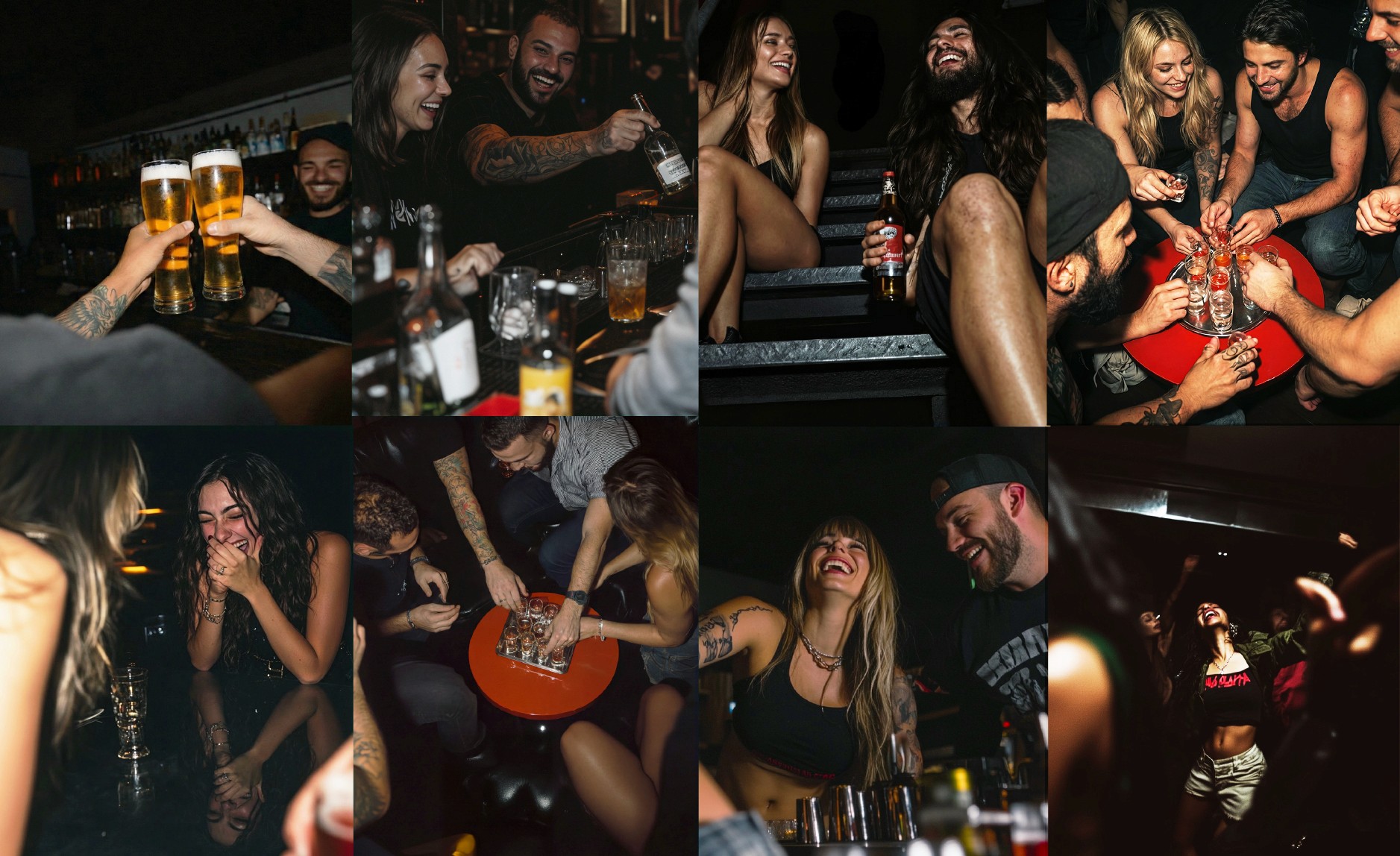 people laughing, talking, drinking together. Authentic connection, not staged scenes.