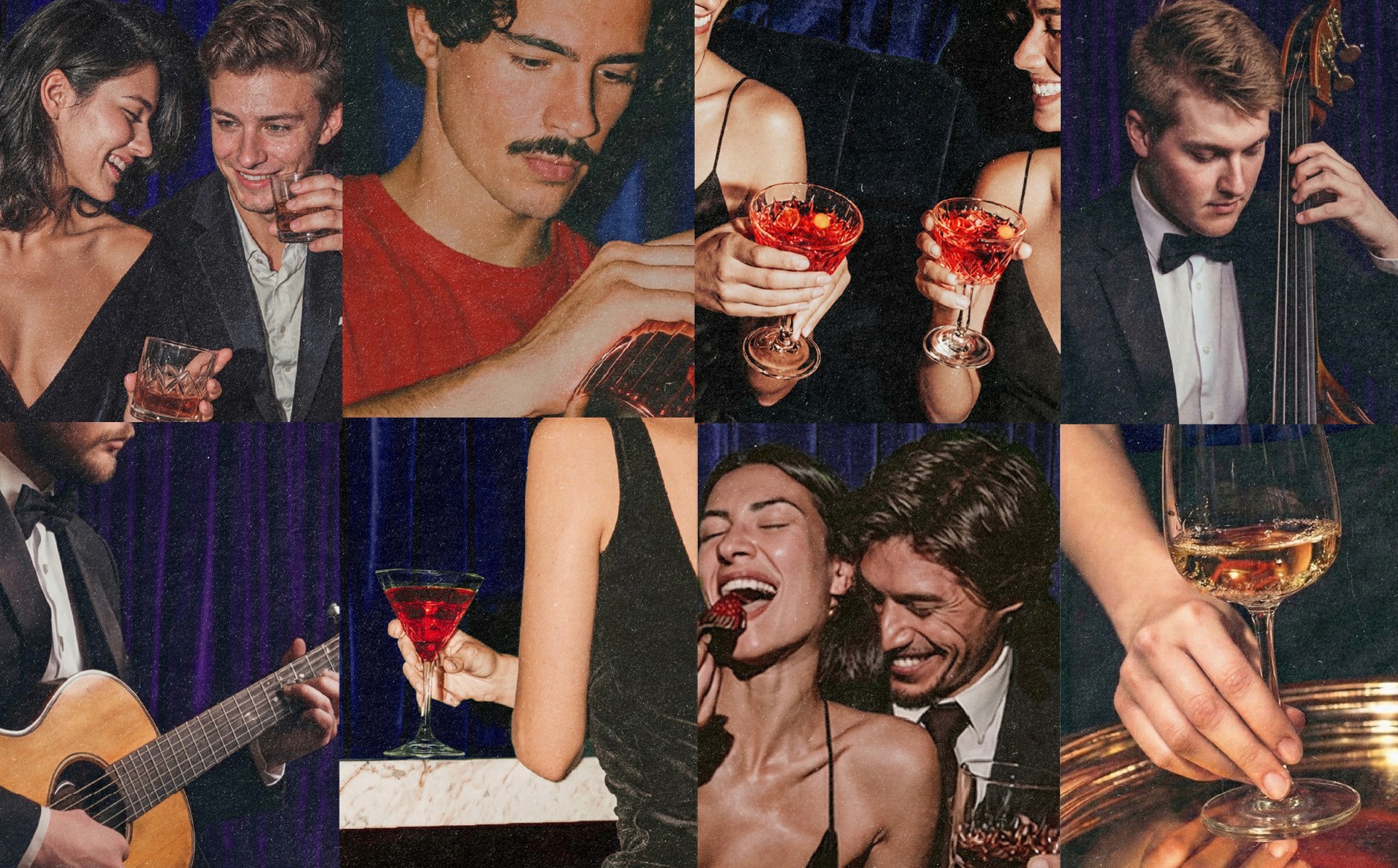 Cocktails, instruments, and atmosphere captured with romance and subtle allure.