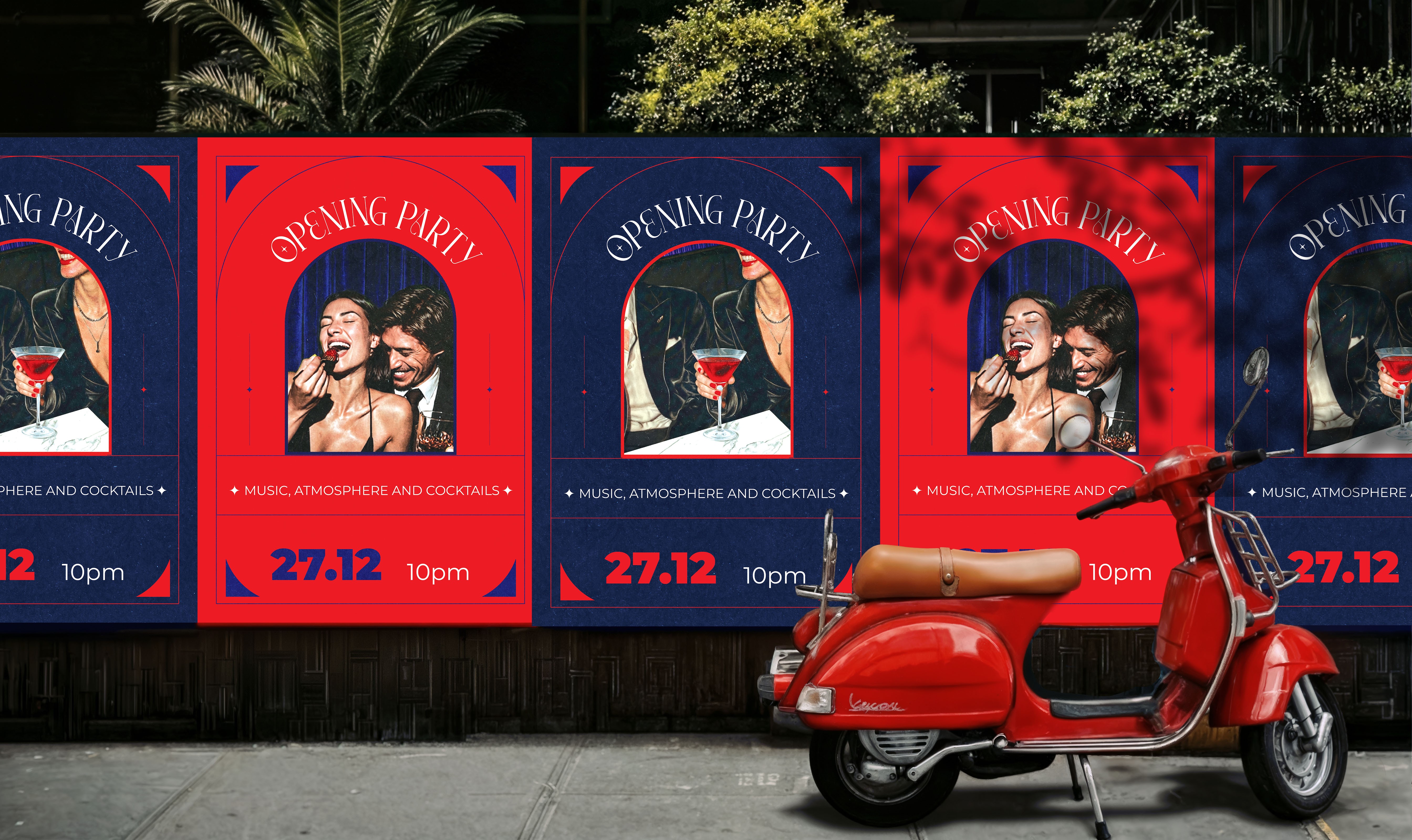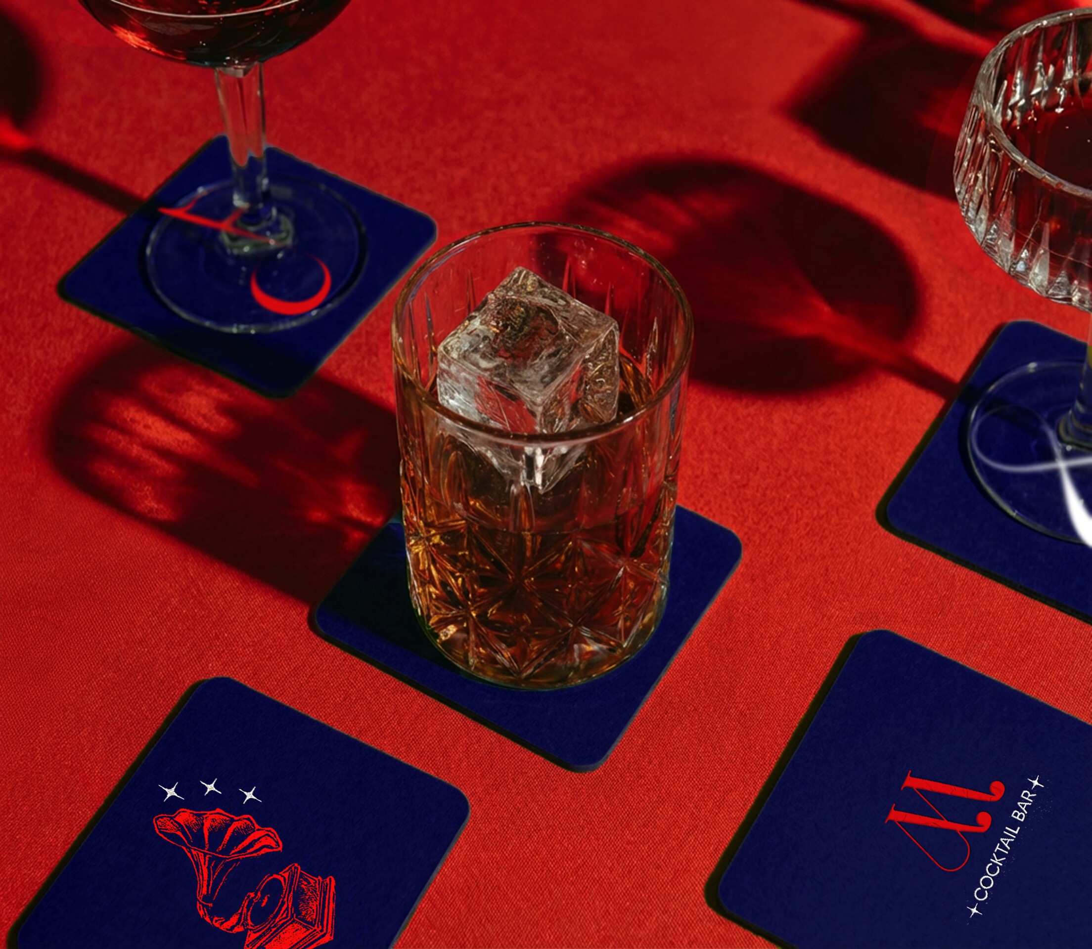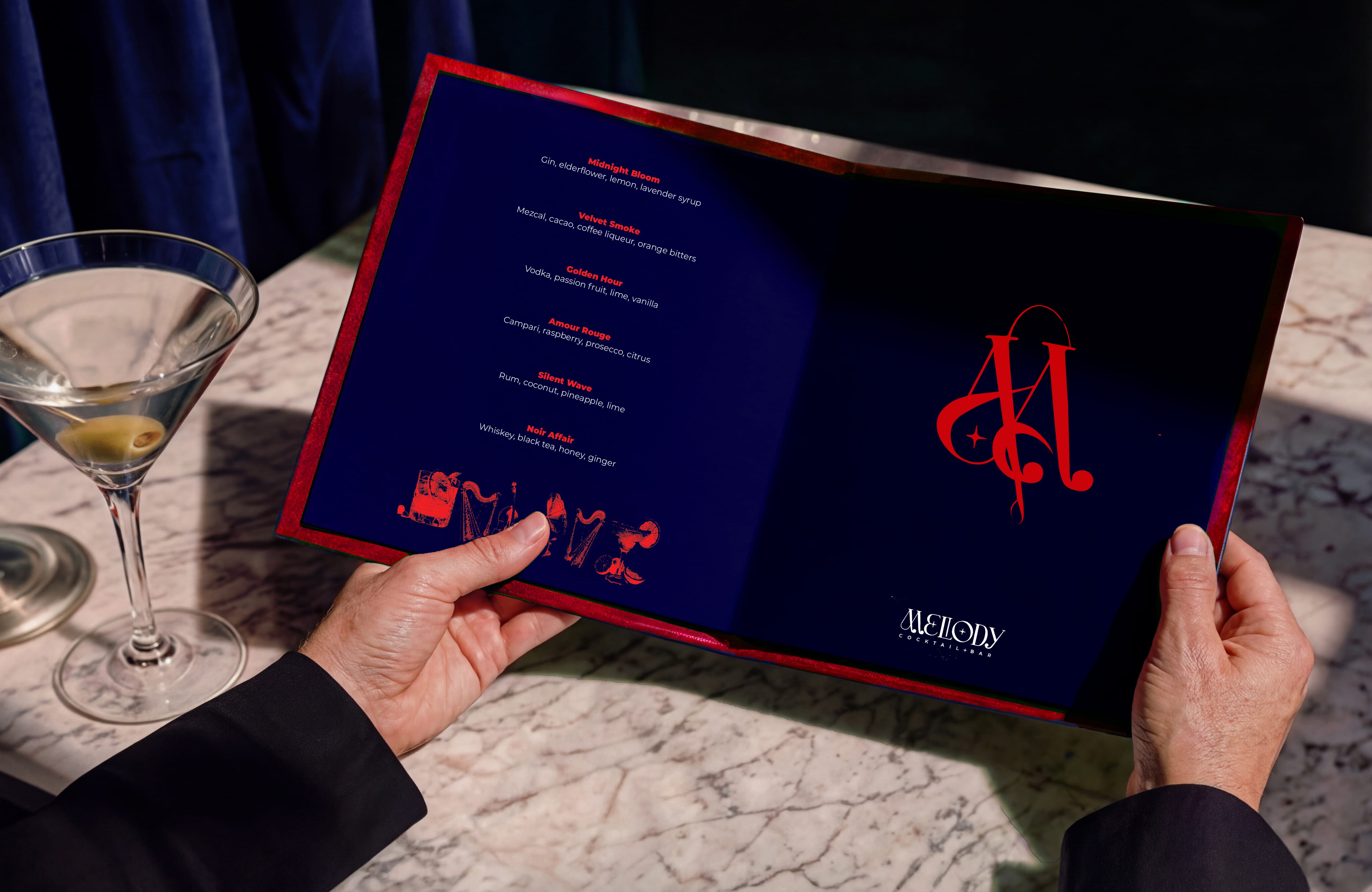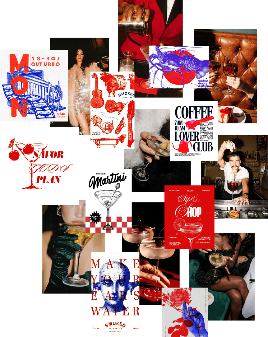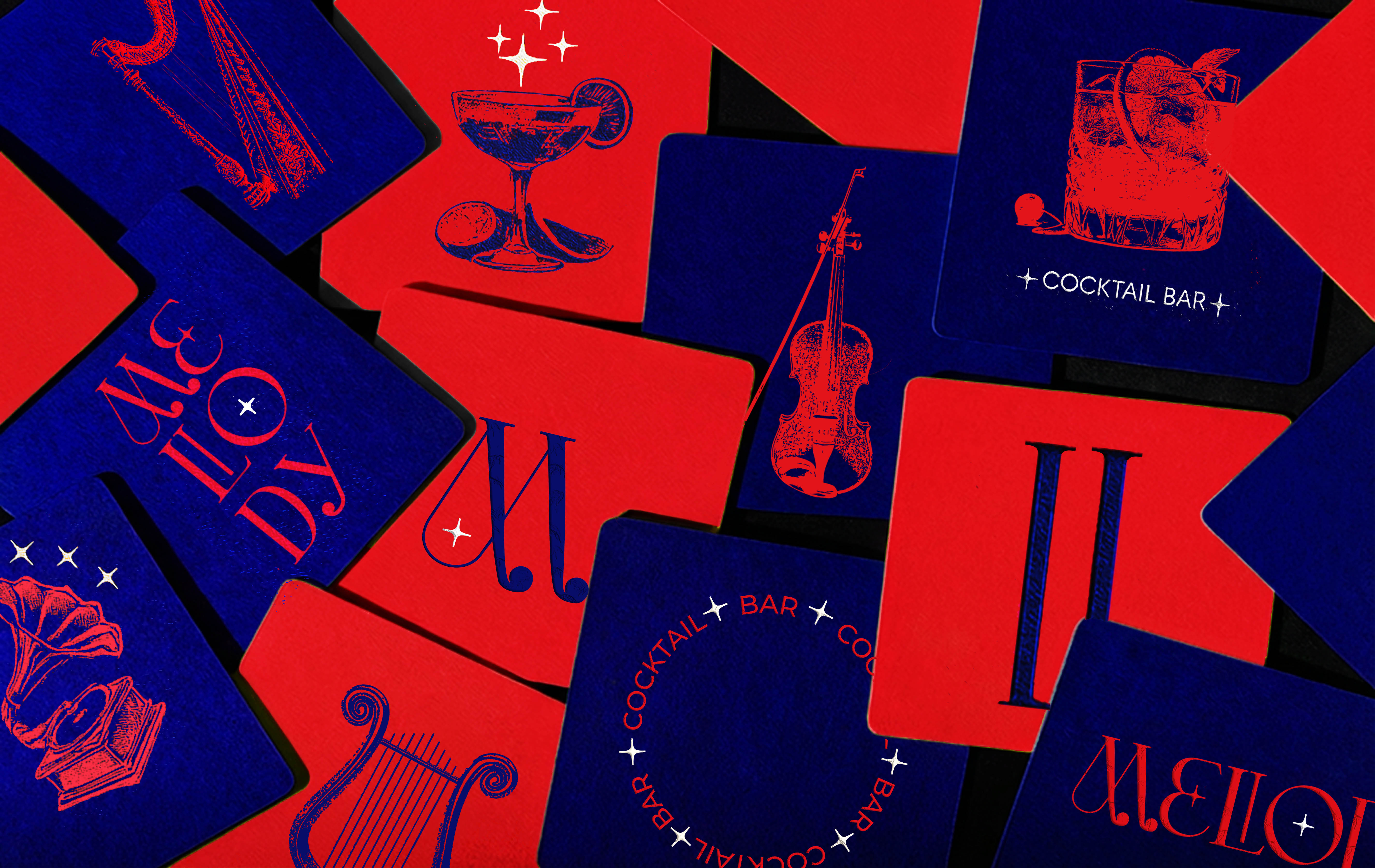 Cocktails and classical instruments rendered graphically, not illustratively.